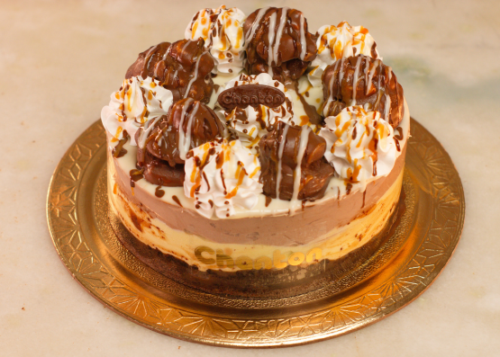 Bolo de chocolate, sorvete de chocolate e mousse de chocolate, brigadeiro ,caramelo, castanha, ganache e carolina recheada de sorvete . Foto ilustrativa. Manter no freezer ou congelador.