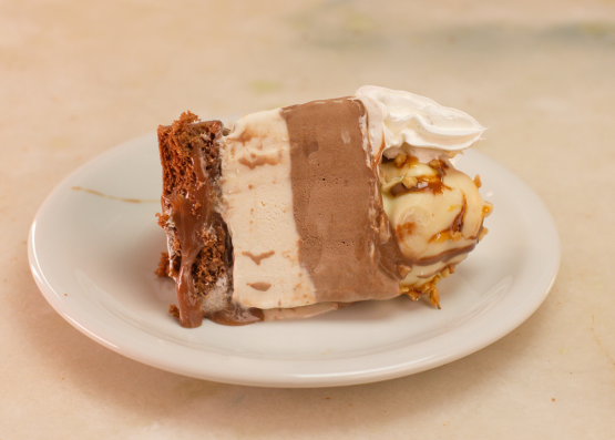 Bolo de chocolate, sorvete de creme e sorvete de chocolate, calda de brigadeiro, caramelo, castanha e carolina recheada com sorvete. Foto ilustrativa. Manter no freezer ou congelador.