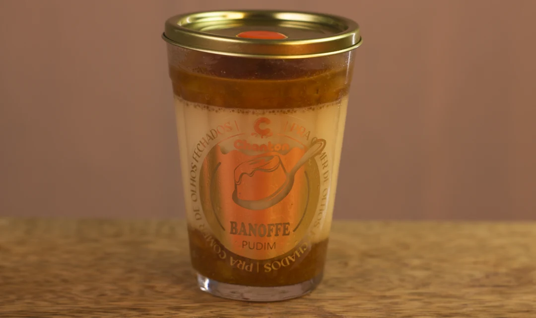 Pudim de doce de leite suave com dupla camada de calda de banana caramelada. Manter refrigerado. Foto ilustrativa.