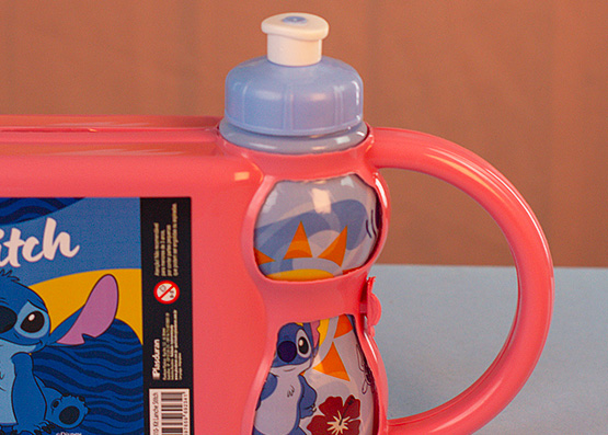 Lancheira contendo um ovo n°10 ao leite puro e uma garrafa squeeze (lancheira licenciado). Foto ilustrativa. Manter em temperatura entre 18ºC e 24ºC.