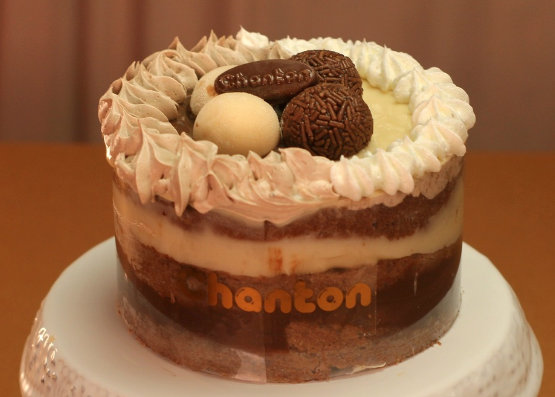 Bolo de chocolate, recheio quatro leites, recheio de doce de leite, cobertura com musse de caramelo e docinhos. Foto ilustrativa. Manter refrigerado.