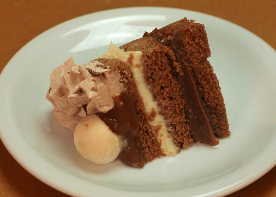 Bolo de chocolate, ganache, creme três leites, musse de chocolate meio amargo e musse de chocolate. Foto ilustrativa. Manter refrigerado