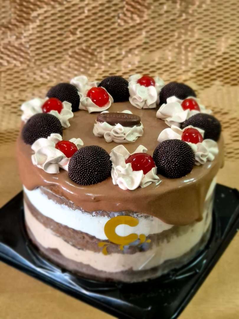 Bolo de chocolate, ganache, creme três leites, musse de chocolate meio amargo e musse de chocolate. Foto ilustrativa. Manter refrigerado. Serve 12 a 16 pessoas - aro 18 cm