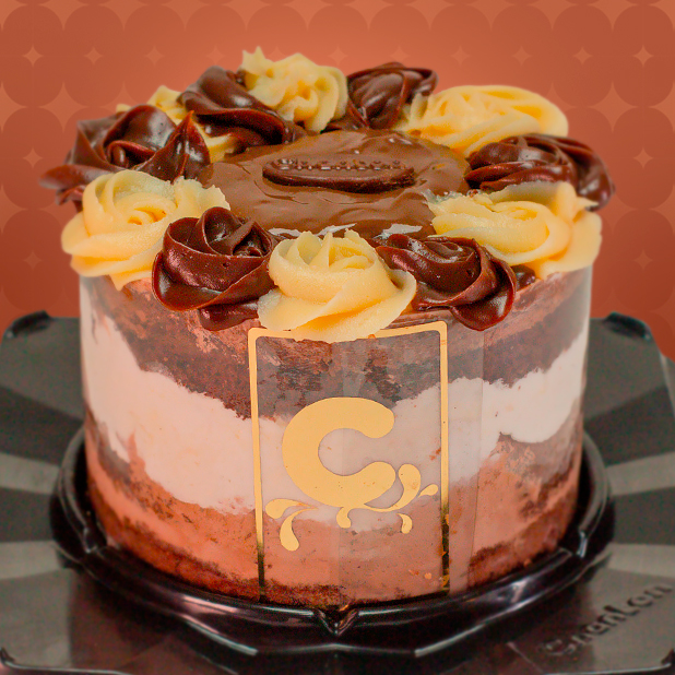 Bolo de chocolate, recheio 4 leites, recheio alpino, cobertura de creme trufado de chocolate, creme 4 leites e ganache. Foto ilustrativa. Manter refrigerado. Serve 6 a 8 pessoas - aro 13cm