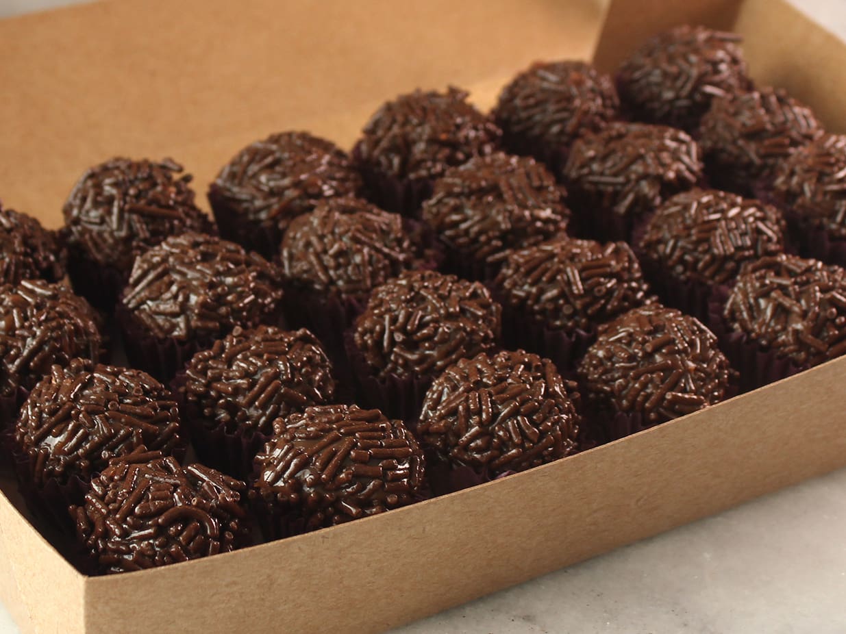 Brigadeiro feito com cacau belga. Caixa com 24 brigadeiros de 15g cada. Este item não acompanha descartáveis.