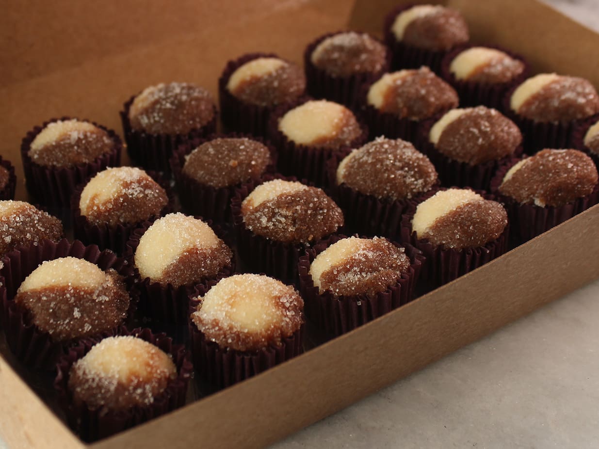 Docinho metade de brigadeiro e metade brigadeiro branco coberto de açúcar. Caixa com 24 unidades. Este item não acompanha descartáveis.