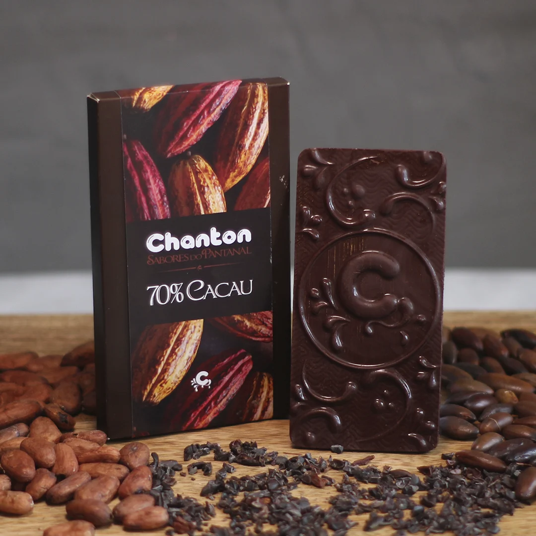 Barra de chocolate 70% de origem sustentável com castanha de caju e baru. 50g. Fotos ilustrativas. Manter em temperatura entre 18ºC e 24ºC.