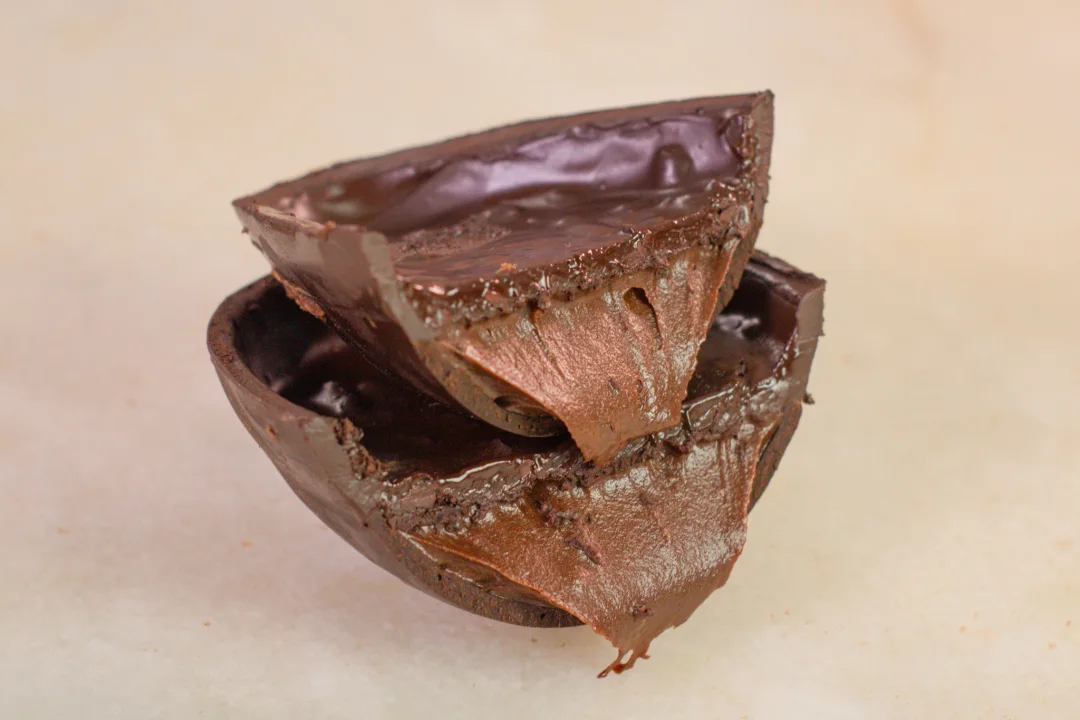 Até 3 x no cartão. Meio ovo de chocolate ao leite, com recheio de bolo Matilda coberto com ganache crunch. Foto ilustrativa. Manter sob refrigeração.