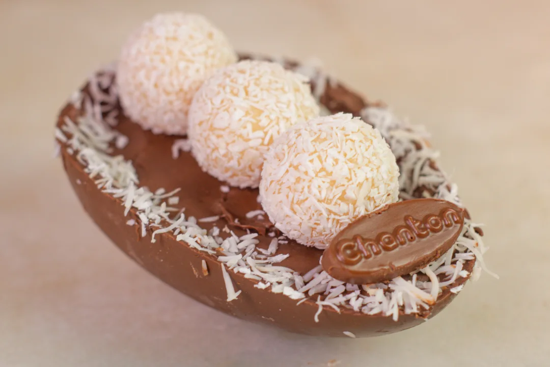 Até 3 x no cartão. Meio ovo de chocolate ao leite recheado de tentação (leite condensado levemente caramelizado com coco). Foto ilustrativa. Manter em temperatura entre 18ºC e 24ºC.