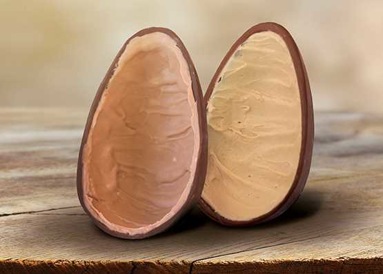 Meio ovo de uma camada de chocolate ao leite puro e uma camada de chocolate e castanha de caju e meio ovo de uma camada de chocolate ao leite puro e uma camada de chocolate e avelã. Embalagens em estampas variadas. Foto ilustrativa. Manter em temperatura entre 18ºC e 24ºC.