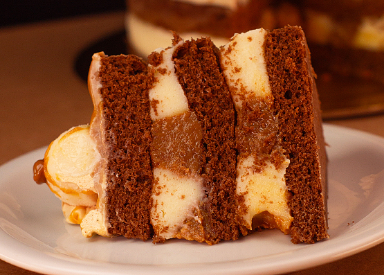 Bolo de chocolate, recheio quatro leites, recheio de doce de leite, cobertura com musse de caramelo e docinhos. Foto ilustrativa. Manter refrigerado.