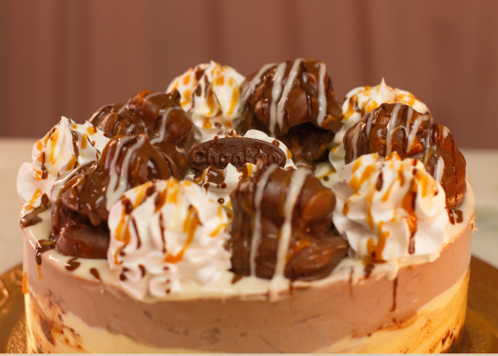 Bolo de chocolate, sorvete de creme e sorvete de chocolate, brigadeiro, caramelo, castanha e carolina recheada com sorvete. Foto ilustrativa. Manter no freezer ou congelador.