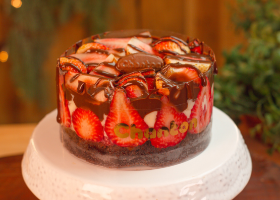 Disco de massa chocolatuda, morango, creme 4 leites e ganache de chocolate. ATENÇÃO: Não retire a faixa, sirva com colher. Foto ilustrativa. Manter refrigerado.