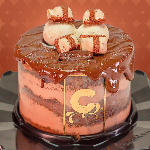 Bolo de chocolate, recheio quatro leites, recheio de doce de leite, cobertura com musse de caramelo e docinhos. Foto ilustrativa. Manter refrigerado.