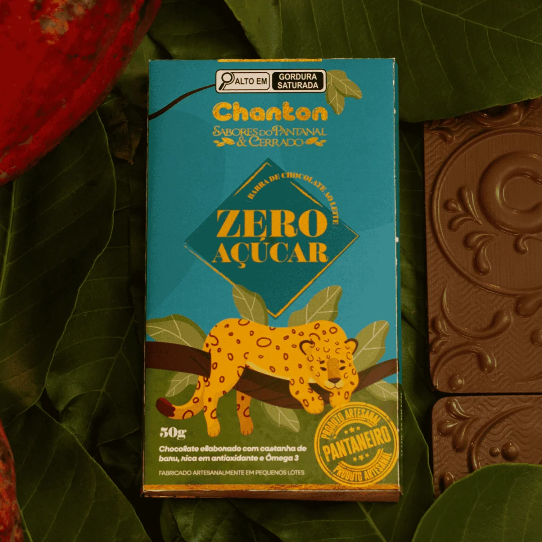 Barra de chocolate 58% recheada com geleia de pequi e caju. Uma verdadeira celebração da biodiversidade brasileira, com ingredientes colhidos na divisa dos biomas Pantanal e Cerrado, na região de Anastácio. O chocolate em si é elaborado com a rara e nutritiva castanha de baru, que confere um sabor amendoado, complementando o perfil do cacau baiano. Seu interior revela um recheio único e cremoso que harmoniza o sabor intenso e sedoso do pequi com a doçura tropical e o toque levemente ácido do caju. O resultado é uma explosão de notas nativas, agridoce e profundamente aromática, que transforma a degustação em uma viagem sensorial pelas riquezas do Centro-Oeste brasileiro. É uma iguaria que une o conceito bean-to-bar à valorização dos superalimentos regionais. A castanha de baru colhida em Anastácio, MS, representa um exemplo de agroextrativismo sustentável na transição entre o Cerrado e o Pantanal, valorizando saberes locais e biodiversidade. Fotos ilustrativas. Manter em temperatura entre 18ºC e 24ºC.